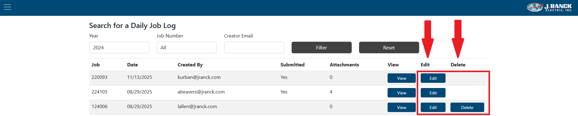 - The edit page will be identical to the page description above used in the daily job log "Create" process after a job number has been selected