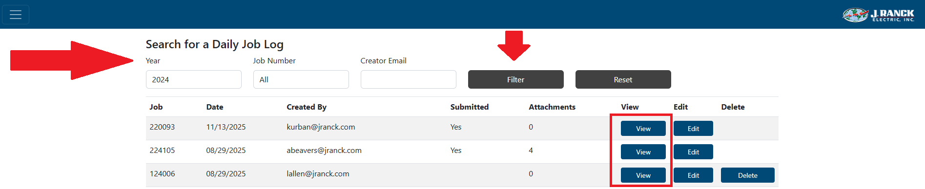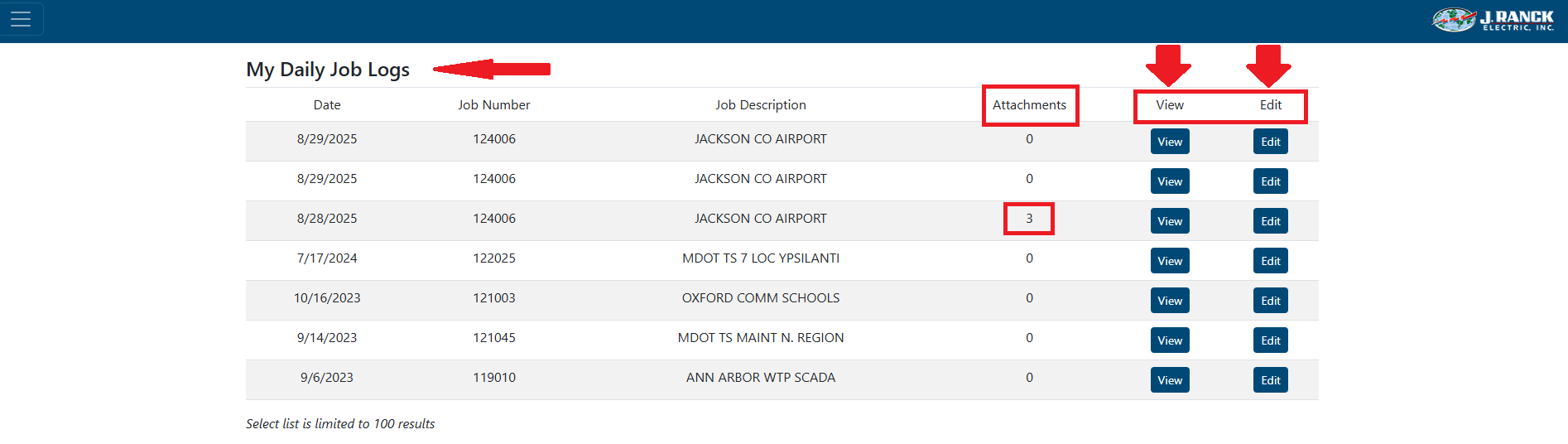 - You can either "View" any of your previous 100 daily job logs or "Edit" daily job logs that have been not submitted yet