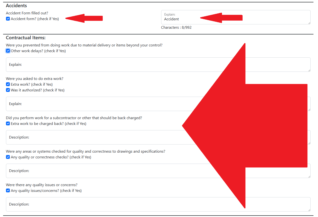 - In Contractual Items section, check any boxes that are applicable and input explanations