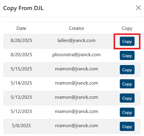 - You will be presented with a screen with a default selection list and filter options for a job number or year and an (optional) email or portion of an email name. Filters can be applied via the "Filter" button or clicking Enter