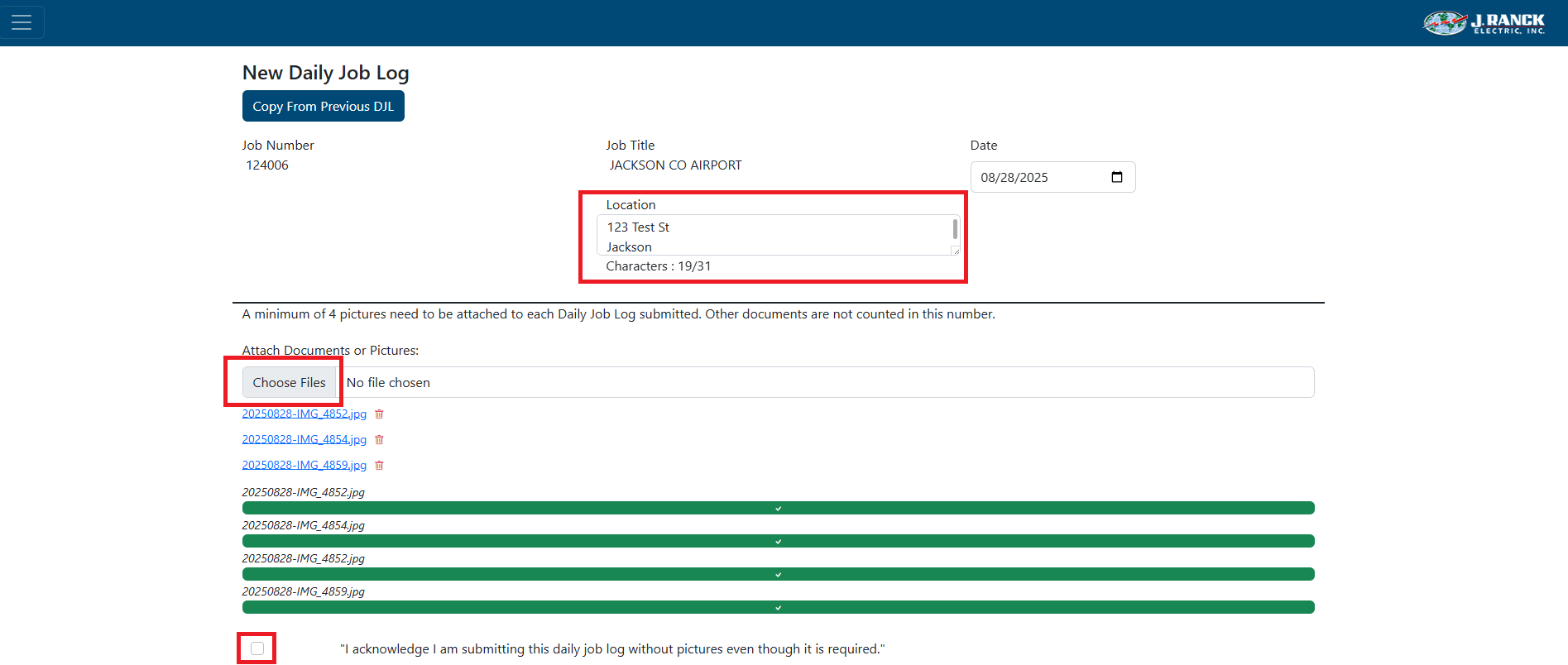 - Attach any documents and pictures NOTE: At least 4 pictures are required to submit a daily job log per day